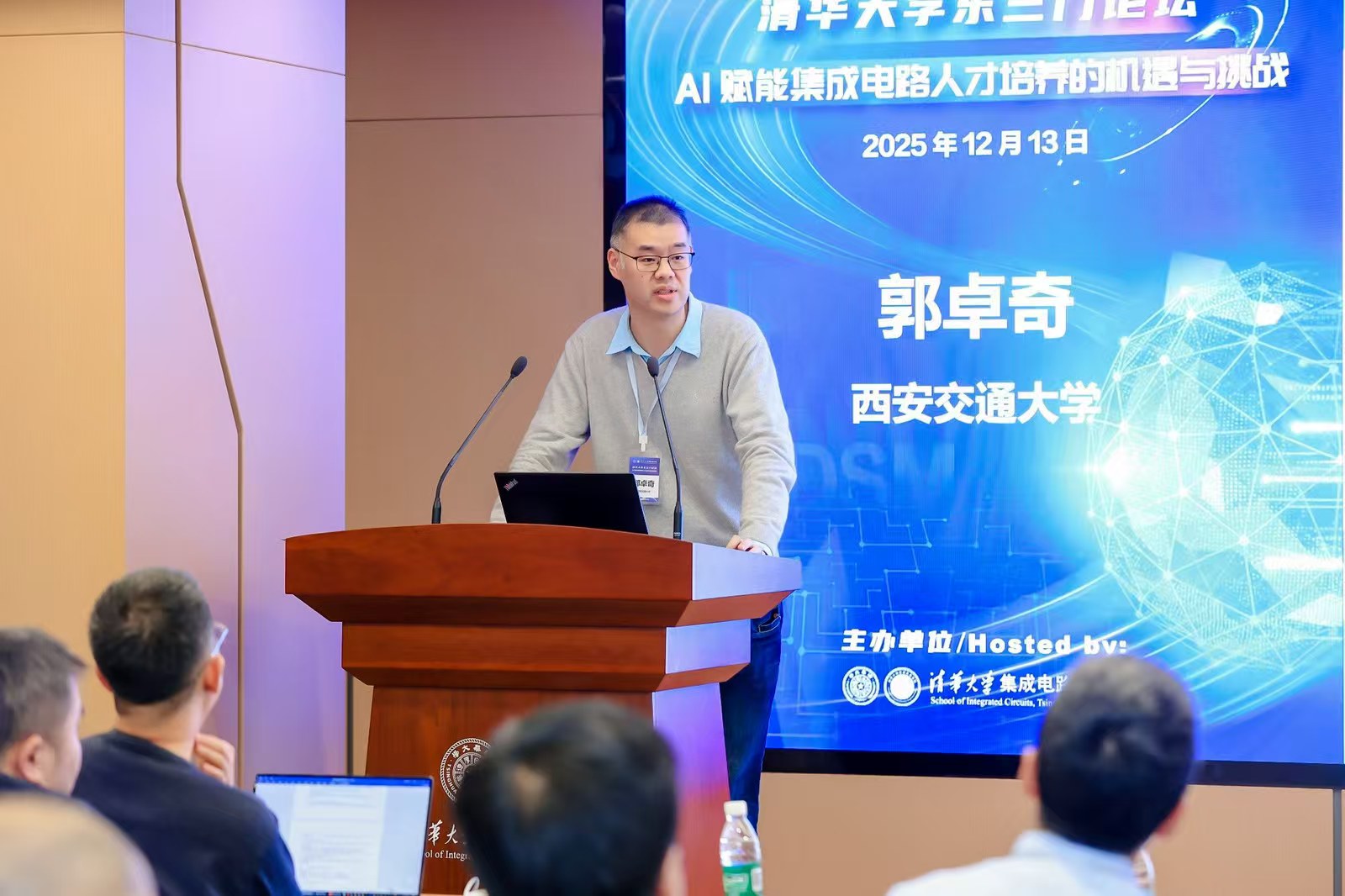 2025年12月13日,由清华大学集成电路学院主办的第二期“清华大学东三门论坛”开幕。论坛聚焦AI赋能集成电路人才培养,分享交流AI赋能集成电路人才培养的模式创新与具体实践,共同探讨未来发展路径与策略。国内40余所高校集成电路和人工智能领域专家学者120余人出席了论坛。北京大学、清华大学、复旦大学、上海交通大学、浙江大学、中国科学技术大学、南京大学、西安交通大学共8所著名高校代表作了论坛报告。西安交通大学微电子学院以“AI赋能《集成电路学科前沿》课程建设与实践”为题,分享了我校在集成电路教育与人工智能深度融合方面的创新探索与实践成果。