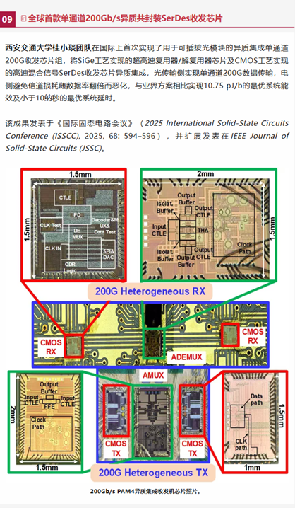 微电子学院研究成果荣获“半导体十大研究进展”提名奖。桂小琰教授团队在国际上首次实现了用于可插拔光模块的异质集成单通道200G收发芯片组,将SiGe工艺实现的超高速复用器/解复用器芯片及CMOS工艺实现的高速混合信号SerDes收发芯片异质集成,光传输侧实现单通道200G数据传输,电侧避免信道损耗随数据率翻倍而恶化,与业界方案相比实现10.75 pJ/b的最优系统能效及小于10纳秒的最优系统延时。